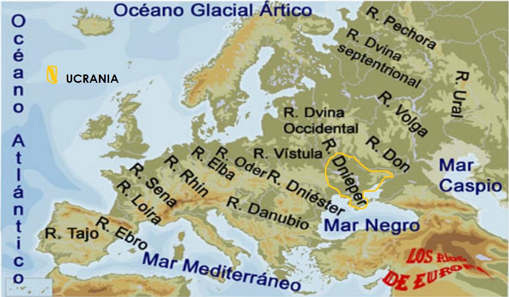 EN EL CONTINENTE EUROPEO SE ENCUENTRA UCRANIA LA CUAL ESTA RODEADA DE EL RIO DON, OCCIDENTAL, DNIESTER, MAR NEGRO Y SOBRE UCRANIA PASA EL RIO DNIEPER COMO LO MUESTRA EL MAPA DE HIDROGRAFIA.
