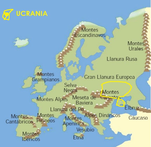 UCRANIA ESTA RODEADO POR LA GRAN LLANURA EUROPEA, MESETA BAVIERA, SELVA NEGRA, ALPES DINARICOS Y SOBRE EL SE ENCUENTRA LOS MONTES CARPATOS.