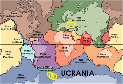 UCRANIA AL SUR TIENE LA PLACA AFRICANA, AL ESTE SE ENCUENTRA LA PALACA DE NORTE AMERICACA, AL OESTE LA PLACA FILIPINA Y UCRANIA SE ENCUENTRA SOBRE LA PLACA EUROASIATICA.