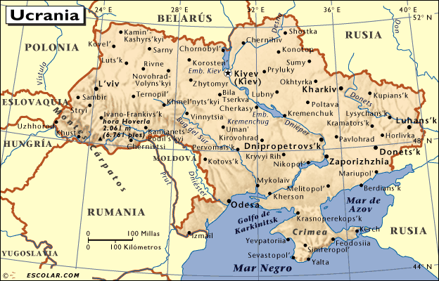 El clima de Ucrania es en su mayor parte continental templado, mientras que es más mediterreano en la costa meridional de Crimea, limítrofe con el mar negro, en lugares como odesa. El promedio de las temperaturas mensuales en invierno varían desde –8 °C hasta 2 °C, son frescos en el mar Negro y fríos en el interior. Los veranos varías desde el frescor a lo largo del mar Negro a frío más lejos tierra adentro. Las temperaturas medias anuales van de los 5,5 °C a 7 °C en el norte, a 11 °C-13 °C en el sur. En verano las temperaturas oscilan entre los 17 °C y 25 °C. El mes más caluroso del año es julio, cuando se llegan a alcanzar temperaturas de 33 °C y superiores. Los veranos son templados en la mayor parte del país, llegando a ser muy cálidos en el sur. En la zona cubierta por la estepa el verano puede ser incluso cálido y sometida a veces a tempestades de arena. La costa del mar Negro está sometida a heladas y ningún puerto ucraniano está permanentemente libre de hielo.